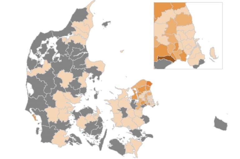 I Vestdanmark har kun hver tredje af kommunerne haft smittede den seneste uge. Alle under ti tilfælde pr. 100.000 indbyggere bortset fra Fanø, som ellers har været uden smittede i lang tid.