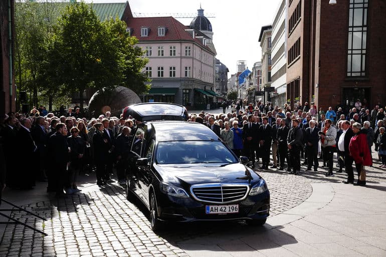 Ifølge TV 2 Østjylland var bænkene indenfor helt fyldt op. Imens viser billeder ude foran kirken, hvordan andre får udleveret programmet for bisættelsen, så de kan følge med over højttalere, der er sat op.