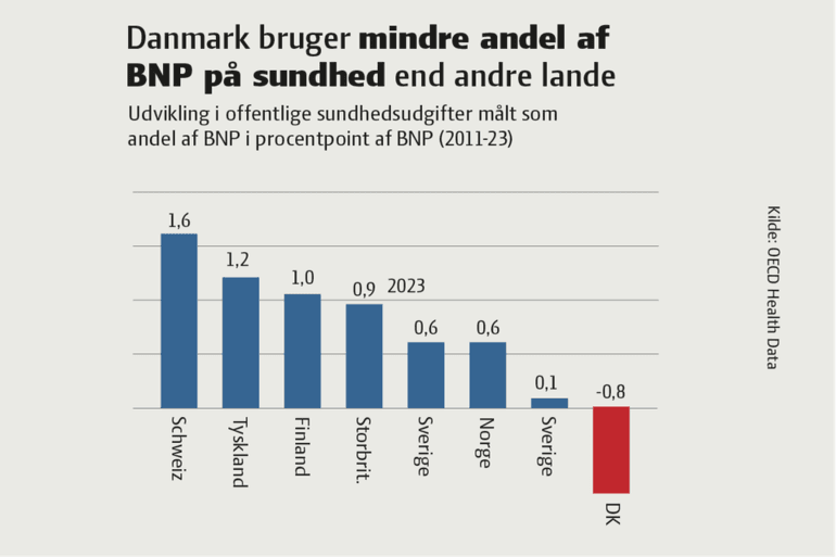 - Målt som andel af BNP brugte Danmark 0,8 procentpoint mindre på det offentlige sundhedsvæsen i 2023, sammenlignet med 2011.