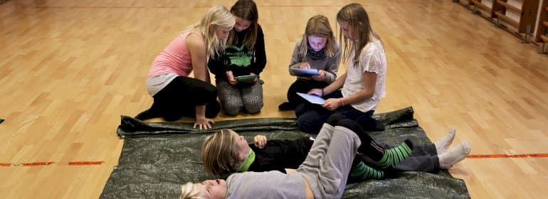 4.b på Brønshøj Skole har matematik og regner på, hvor stort et areal de skal bruge, så hele gruppen kan ligge på presenningen uden at røre hinanden.