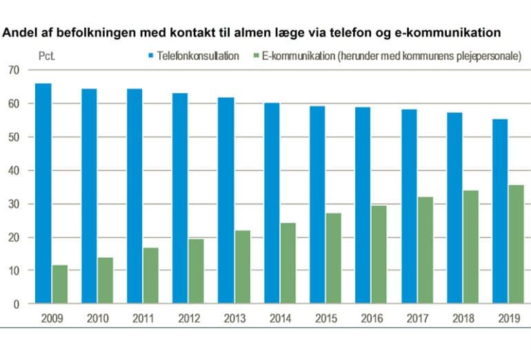 Omvendt var andelen af personer, der i samme periode havde kontaktet almen læge via telefonkonsultationer, faldet fra 66 pct. i 2009 til 55,5 pct. i 2019, men andelen lå dog fortsat på et højere niveau end e-kommunikation, som blandt andet dækker ikke-hastende spørgsmål og svar på laboratorieundersøgelser, mens receptfornyelse og tidsbestilling ikke tæller med.