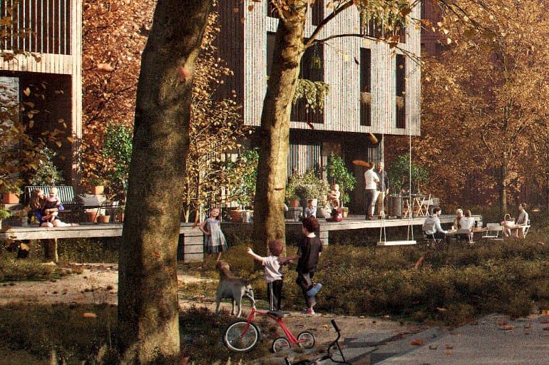 Henning Larsen Architects står bag masterplanen for bydelen, der får hjemsted ved Vejlands Allé med adgang til det bynære naturområde Amager Fælled og skal indfri ambitionen om at blive Københavns første bæredygtige bydel med træ som gennemgående byggemateriale.