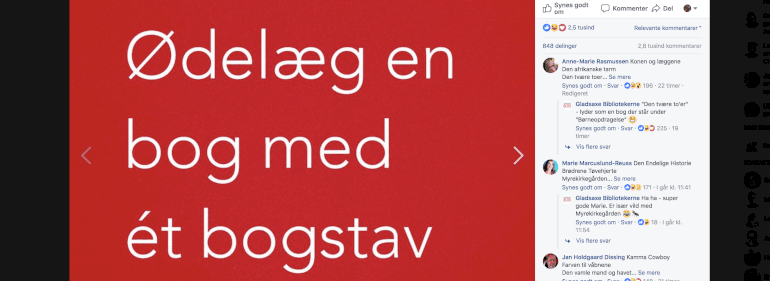 GLADSAXE: Det er ikke hver dag, at man ser biblioteker opfordre folk til at ødelægge bøger. Men det var ikke desto mindre, hvad Gladsaxe Bibliotekerne har gjort i denne uge. I et Facebook-opslag bad biblioteket sine følgere om at ‘ødelægge’ litteratur ved at ændre ét bogstav i en bogs titel. Det kom der nye og sjove titler ud af som eksempelvis: 'Vredens Duer' og 'Den Afrikanske Tarm'.