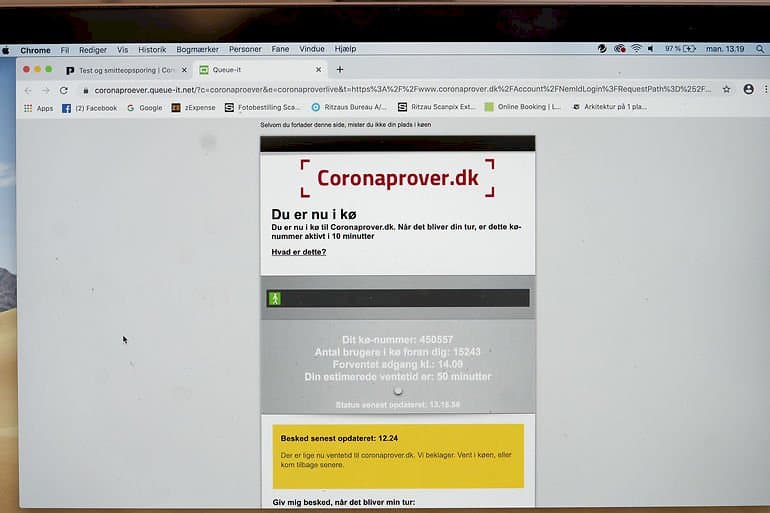 På hjemmesiden coronaprover.dk, hvor man kan booke testen, er der en ventetid på omkring en time. Det bliver også oplyst, at flere end 16.000 brugere står foran i køen.