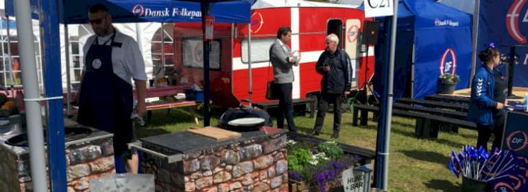 Blandt partierne er andelen af ikke-telte lidt højere, og et af dem der har valgt noget andet er Dansk Folkeparti – nemlig ingenting. Sådan da, for der er et køkkentelt og som blikfang den velkendte dannebrogsfarvede campingvogn, men ellers foregår alt under åben himmel og især uden teltvægge, selv om der er et par pavilloner og et læs paraplyer i baghånd, hvis vejret skulle kræve det. Et bevidst valg, ligesom grillmenuen i køkkenteltet. Drikkevand og tørkost til publikums medbragte hunde er derimod ikke en kølig kalkule, men det virker nu meget gennemført alligevel.
