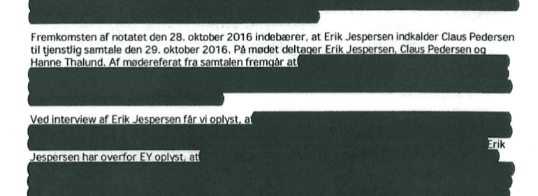 I rapporten hedder det, at Claus Pedersen og en person, hvis navn er overstreget, 'umiddelbart har fortiet/nedtonet alvoren i chikanesagen. HR-chef Hanne Thalund ses ikke at have foretaget egne undersøgelser vedrørende informationer modtaget fra henholdsvis Claus Pedersen og (navn overstreget).'