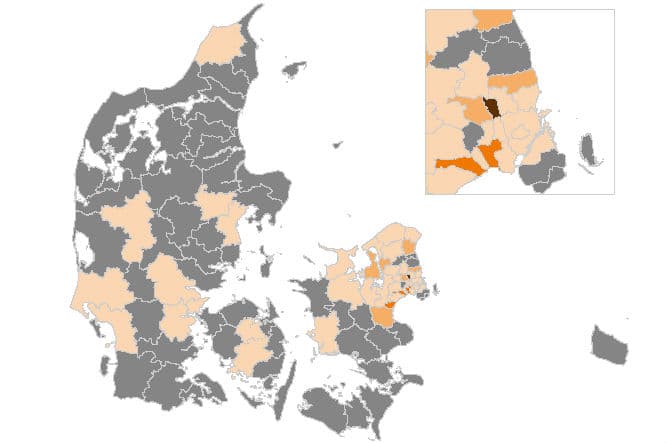 Kun otte kommuner har den seneste uge haft over ti smittede pr. 100.000 indbyggere. De ligger dog alle i det østlige og nordlige Sjælland, nemlig Herlev, Brøndby, Ishøj, Solrød, Køge, Lyngby-Taarbæk, Fredensborg og Frederikssund.