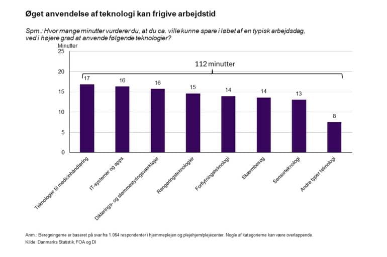 Der er tid og penge at spare ved at udbrede velfærdsteknologier i højere grad. En analyse lavet af FOA og DI viser, at social- og sundhedsmedarbejdere i ældreplejen mener, at en øget brug af teknologiske hjælpemidler vil frigøre op til 25 pct. af deres arbejdstid. Det svarer til 112 min. om dagen pr. medarbejder.